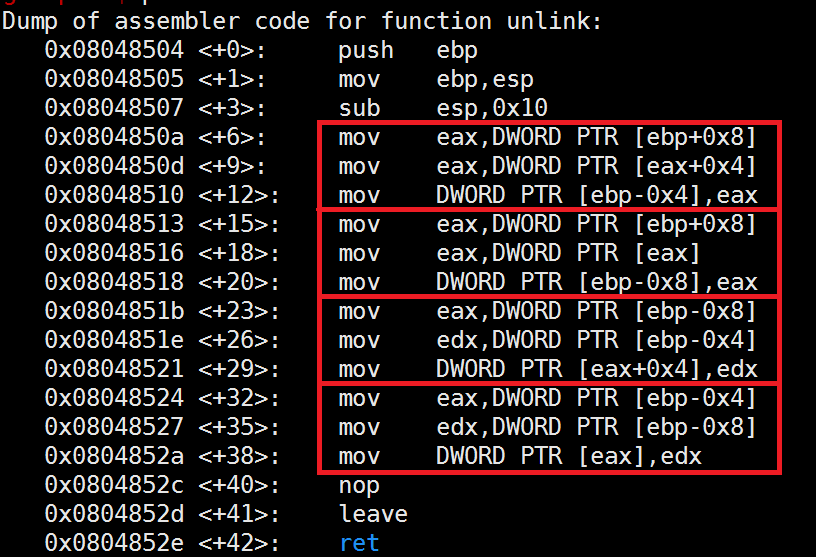 unlink 함수의 어셈 코드인데, 원래 4줄의 코드가 저렇게 4블럭으로 나누어지고, 따로 특이사항은 없었다.