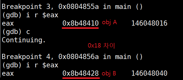 아까 위에서 A와 B의 주소차이가 0x18만큼 난다고 했는데, 시작 주소의 차이가 그만큼이고,